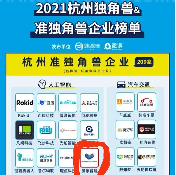 2021年四月 , 杭州市人民政府、民建浙江省委、中国投资发展促进会共同主办的第五届万物生长大会在杭州召开 。 会上,杭州市创业投资协会发布了《2021杭州准独角兽企业榜单》( “独角兽”(估值不少于10亿美元)——支付宝,“准独角兽”(估值不少于1亿美元) 。 星际小象 (魔象智能) 凭借世界领先的仿生智能技术荣列榜单 。 入选这份最权威榜单的企业,需符合以下条件:估值在 10 - 70 亿 、拥有独创性或颠覆性技术和难以复制的商业模式,且后期有巨大机会成长为千亿级企业。