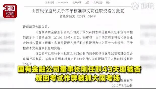 有接近晋商银行的人士称,此次李文莉是因为在高管从业资格考试中作弊被发现,因此被取消从业资格,并且一年内禁止担任金融机构高管职务。另据@时间视频,李文莉还曾因考试作弊大闹考场。