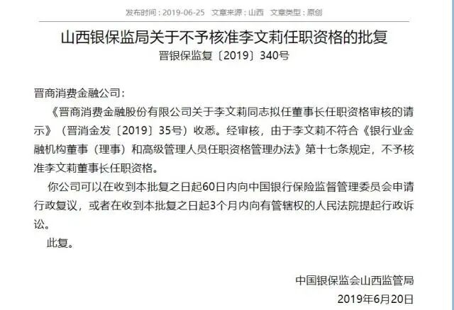 6月25日,银保监会网站发布的信息显示,李文莉拟任晋商消费金融董事长的任职资格未得到山西银保监局批复同意,在一众“已通过”中显得十分突兀。