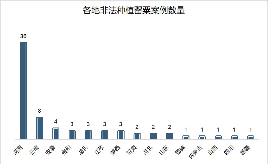 涉及非法种植的案例中,河南省数量最多,有36个,其中该省下辖的唐河县有14个。