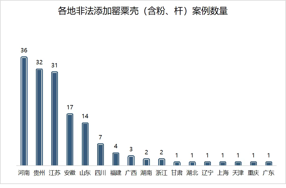 图源:澎湃新闻,数据来源:裁判文书网各地非法添加罂粟壳(含罂粟壳粉、罂粟杆)案例数量