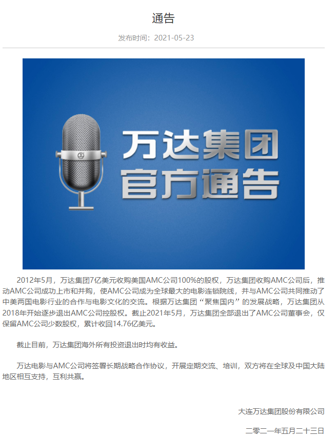 通告称,万达集团从2018年开始逐步退出AMC公司控股权。截止2021年5月,万达集团全部退出了AMC公司董事会,仅保留AMC公司少数股权, 累计收回14.76亿美元(约合97亿人民币)。