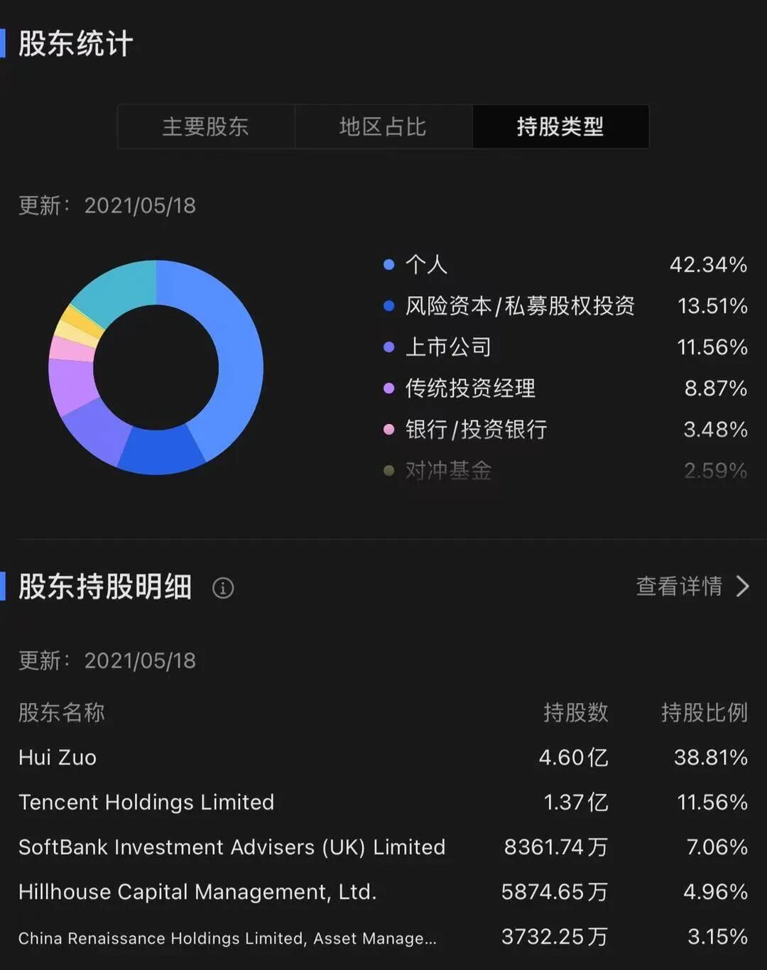 资料显示,左晖持有4.6亿股贝壳,持股比例38.81%,此外腾讯也持有1.37亿股,占比11.56%。