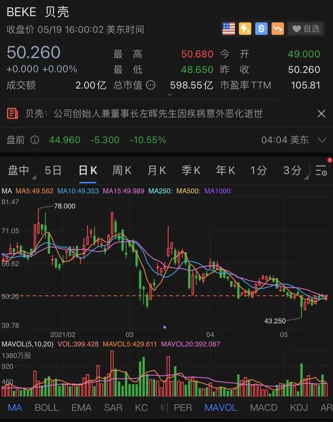 同一时间段,贝壳找房公司官网亦发布公告称,公司创始人兼董事长左晖因意外疾病恶化,于2021年5月20日去世。