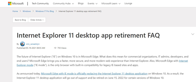 多年来,这款老化的网络浏览器基本上没有太多消费者使用,微软决定在2022年6月15日让这款历史悠久、影响深远且引发巨大争议的软件彻底退役,全线改用Microsoft Edge。微软没有明确说明退役的方式,但很可能我们最终会看到IE浏览器在2022年6月或不久之后像Flash一样消失在操作系统中。