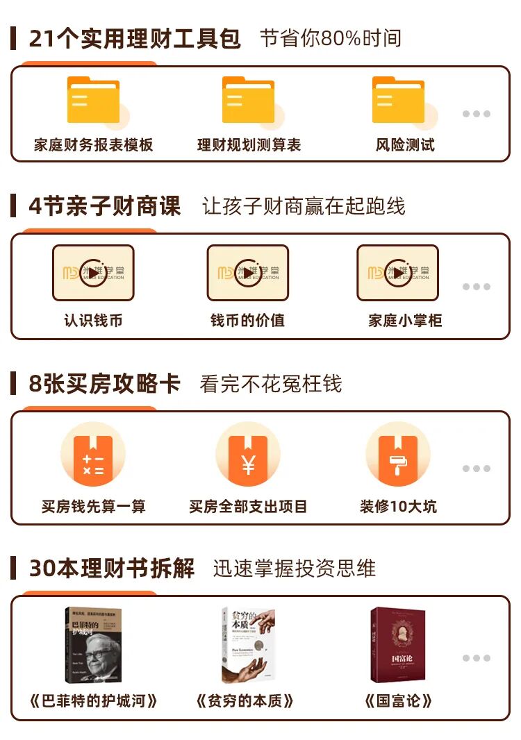 除了课程本身外,每天还为大家准备了 早读+午间防骗+夜读 图文学习环节,也是干货满满,部分内容如下:《如何从穷人思维过渡到富人思维》《荐股骗局》《买基金踩的坑》《作为家庭的经济支柱,如何买保险》《如何突破工资天花板》……