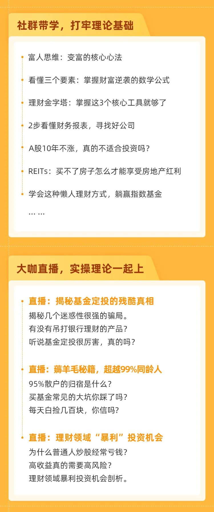 如果你是: 那么,此次训练营很适合你!通过 社群+直播学习+ 一对一答疑服务 解决理财问题, 开启财富 自由之路 。
