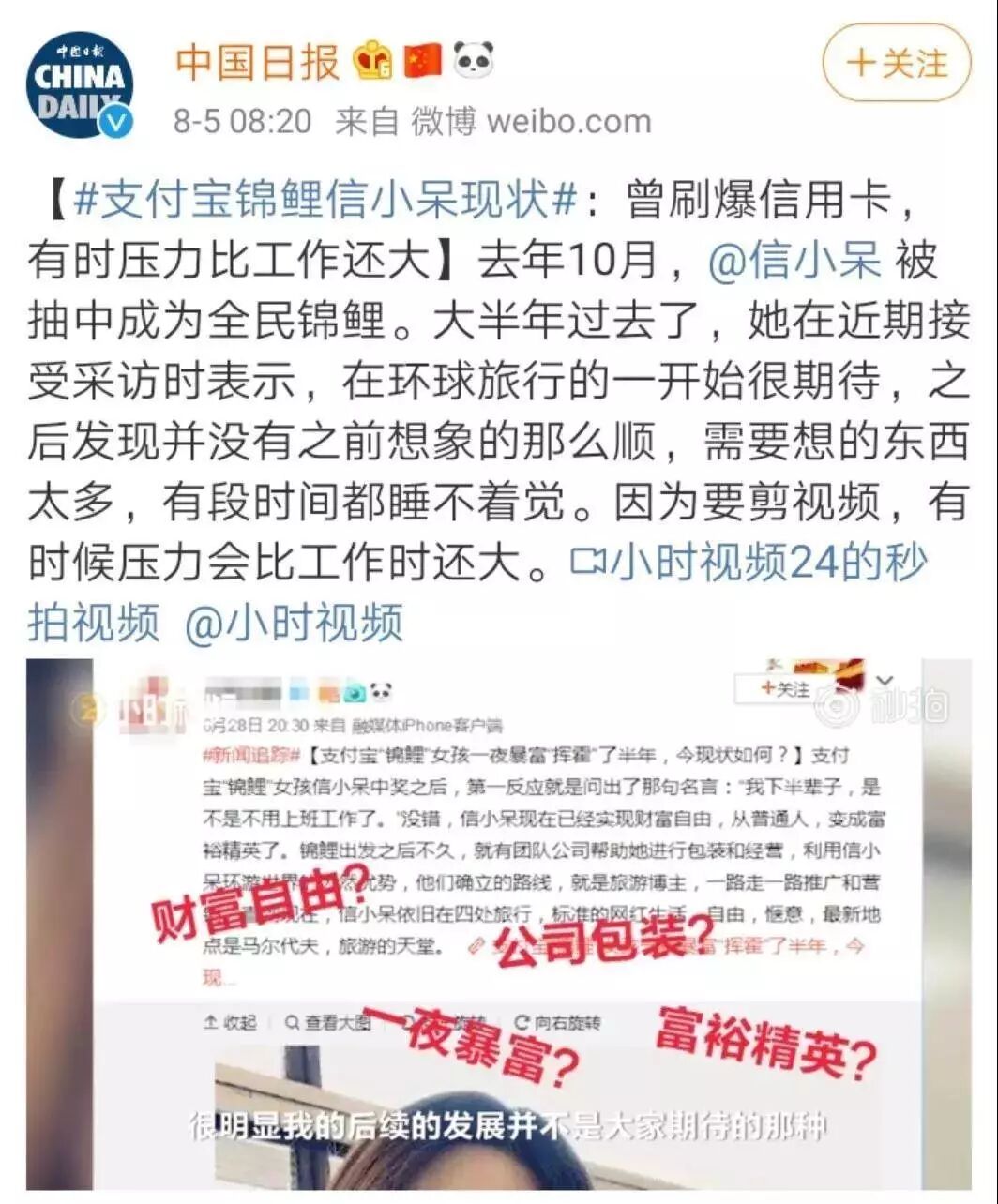 还记得那年的“支付宝锦鲤”吗?获得价值上亿的“全球免单大礼包”后,信小呆即刻发微博:“我下半生是不是不用工作了?” 没想到“锦鲤之旅”才走了半年多,信小呆就因“刷爆信用卡”,又登上了热搜。