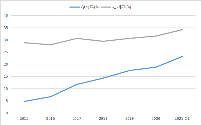 公司毛利率较为稳定,保持在30%左右,而净利率则逐年递增。