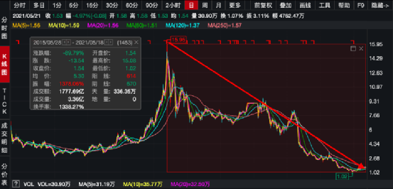 二级市场上,*ST金正股价屡创新低,股民大范围严重套牢。截至发稿,*ST金正报1.53元/股,最新市值50.3亿元,较2015年高点暴跌近90%。