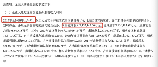 经查明,2015年至2018年上半年,金正大及其合并报表范围内的部分子公司通过与其供应商、客户和其他外部单位虚构合同,空转资金,开展无实物流转的虚构贸易业务,累计虚增收入230.73亿元,虚增成本210.84亿元,虚增利润总额19.89亿元。