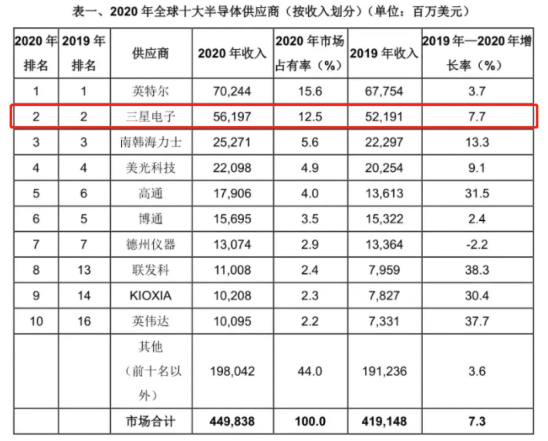 三星作为全球半导体产业的领导企业,不单生产自家的手机芯片,还为另一芯片巨头高通代工。市场研究机构Gartner以半导体供应商2020年收入进行划分,其中排名前十名的企业分别为:英特尔、三星电子、SK海力士、美光、高通、博通、德仪、联发科、铠侠、英伟达。三星电子在2020年市场占有率达12.5%,且进一步缩小与英特尔之间的差距。来源 / 市场研究机构Gartner