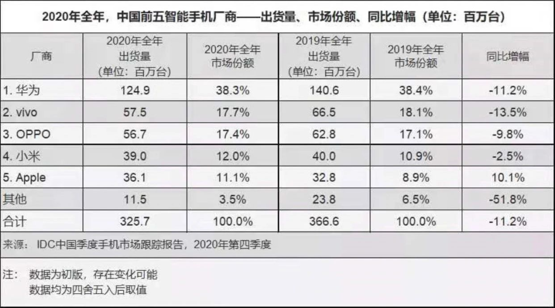 近几年,国内手机市场份额前五名的席位被华为、OPPO、vivo、小米和苹果牢牢掌控着。据IDC中国季度手机市场跟踪报告显示,2019年及2020年,上述五家手机厂商所占市场份额合计分别为93.5%和96.5%。来源 / IDC咨询