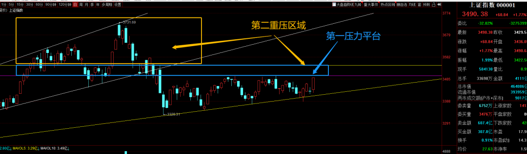 上证市场周五的大幅拉升目前处在第一压力平台下方,下周有望再次出现上攻的动作,当然这很可能要看券商的表现,从短期小时级别来看周一上午还有上升的动力,注意观察量与价的配合,第一压力平台的承压力度较大,这里是前期破位之前的套牢盘密集区域。