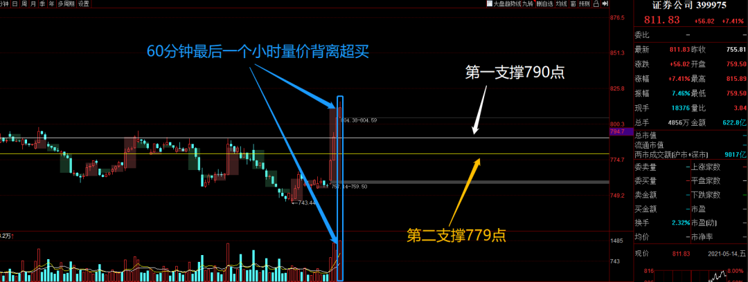 那么我们在看一下证券公司的小时级别走势,从60分钟走势上看目前出现了小时级别的超买信号,那么预示着周一不管是高开也好还是低开平开,短期出现的拉升我们是不能进行参与的,因为随时会有超买之后的技术调整。