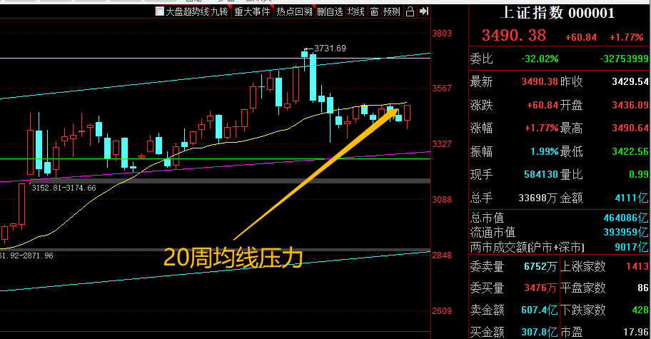 从周线上看,上证这边一只受限于20周均线3500的位置,这里本周是关键点,如突破市场总体会翻多中期走势会有较长一段的上升空间出现,甚至会挑战新高。