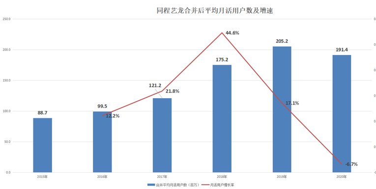 从用户角度来看,腾讯的助力确实帮助同程艺龙快速增长。按合并后去重口径统计,2015年至2019年,同程艺龙平均月活用户数由8870万人增长至2.05亿人,年化复合增长率接近24%。