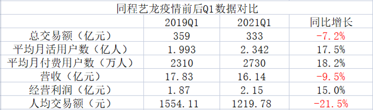 对比2019年和2021年Q1的核心经营数据,我们可以清晰的发现,虽然同程艺龙的总交易额和总营收分别下滑7.2%和9.5%,但整体用户体量却显著增长。