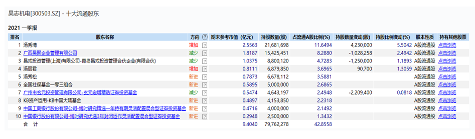 面对如此来势汹汹的减持动作,对于一般的投资者而言,唯恐避之不及。但是转眼到了2021年一季度,却惊喜的发现,昊志机电的前十大流通股东中又换了一批新鲜面孔。
