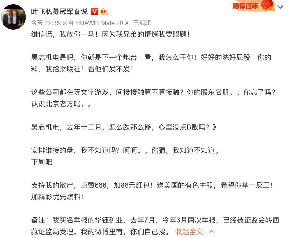 5月以来,微博大V叶飞凭借一己之力让多家上市公司和资管机构心神不宁、忧心重重,也让A股广大的投资者和吃瓜群众拍案而起、拍手叫绝。