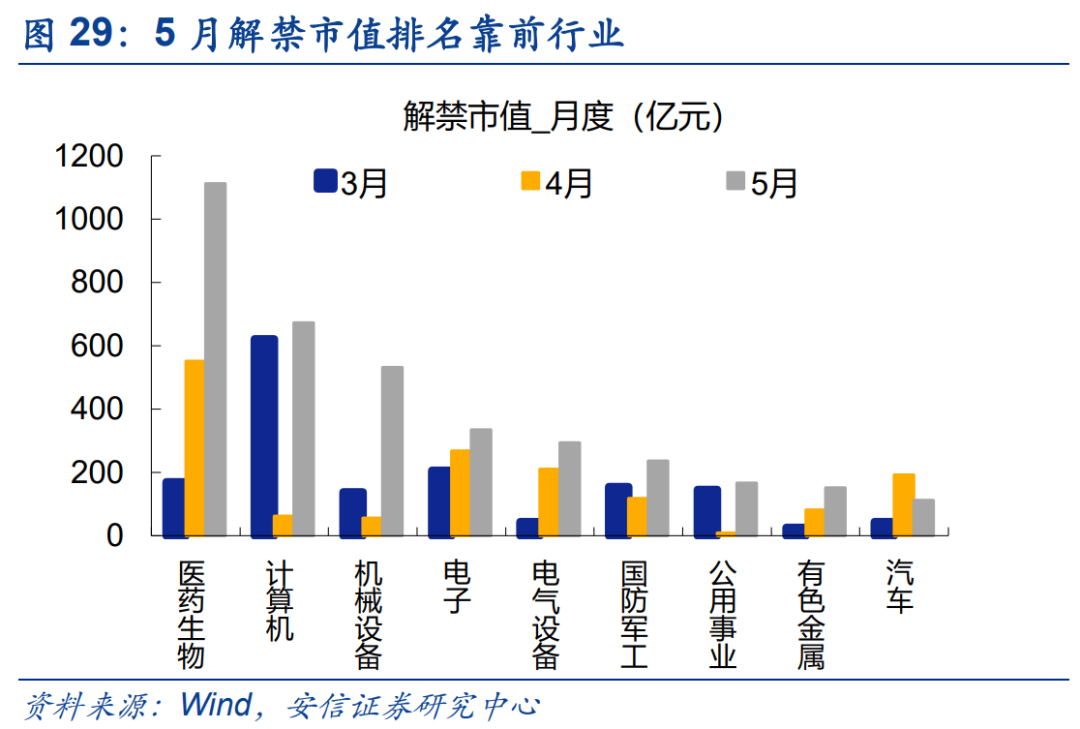 上周减持处于正常水平,6月解禁压力有所提高。 至5月22日已有披露,本周重要股东净减持52.0亿元,较前期(70.0亿元)有所减少,仍为两年来相对低位水平;净减持金额较高的行业包括医药生物(30.7亿)、有色(6.9亿)、电子(6.8亿)。限售解禁方面,上周(至0521)限售解禁规模约1062亿元,本周规模约1107亿元,处于历史高位水平。本周解禁规模较大的个股包括有科沃斯(约608.8亿)、北京君正(约114.5亿)、诚志股份(约53.9亿)。6月解禁规模预计为7855.6亿元,解禁规模靠前的行业包括电气设备(3916亿)、非银(1938亿)、医药(660亿)、机械设备(304亿),解禁压力有所提升。