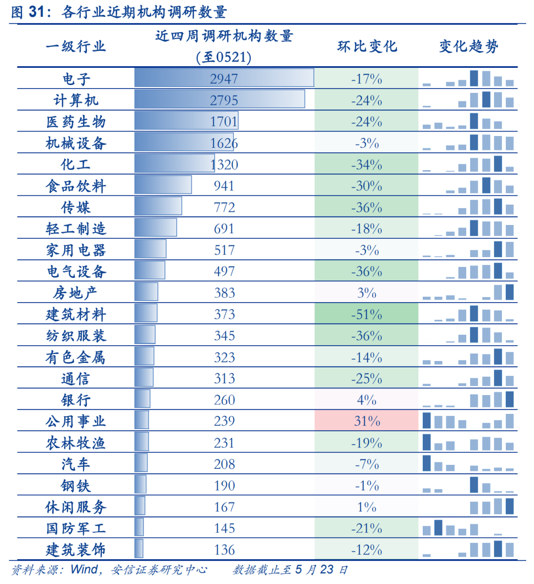 近期机构调研热度较高的行业包括电子、计算机、医药、机械设备;调研热度明显上升的行业包括公共事业;调研热度明显上升的二级行业包括园区开发、橡胶、电力、其他交运设备等。