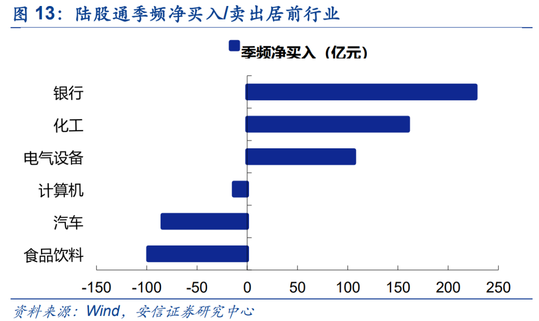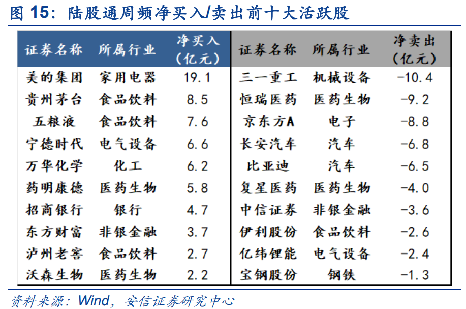 上周北向资金累计净流入4.8亿元,已连续6周实现净流入 (上周陆股通仅开放3个交易日)。上周新加入陆股通的个股包括雷赛智能、荃银高科、晨光生物、迪瑞医疗。 配置型外资持续增配消费板块,减仓制造业;食品饮料连续两周获净买入 。以周频看,食品饮料(约25.7亿,交易型资金为主)、家电(约24.7亿,配置和交易型资金并重)、医药(约11.5亿,配置和交易型资金并重)、银行(10.9亿,配置型资金为主)获北向资金净增持居前;电子(-24.6亿,配置型资金为主)、汽车(-15.9亿,配置型资金为主)、机械设备(-12.8亿,配置和交易型资金并重)净减持居前。近四周来,银行(62.4亿,配置和交易型资金并重)、电气设备(55.7亿,配置型资金为主)、钢铁(42.2亿,配置型资金为主)获北向资金净增持居前,汽车(-44.0亿,配置和交易型资金并重)、非银(-41.5亿,配置和交易型资金并重)、电子(-35.5亿,交配置型资金为主)净减持居前。