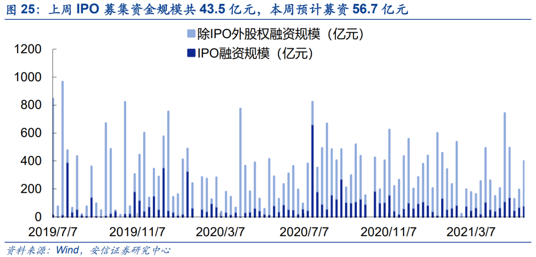 本周资金需求处于正常水平 。上周股权融资规模共399.6亿元,较前期(195.6亿)上升204.1 亿元,处于正常区间,其中IPO融资80.7亿元;本周(5.24-5.28)将有11只新股将进行网上发行,预计募资95.2亿元,处于正常水平。