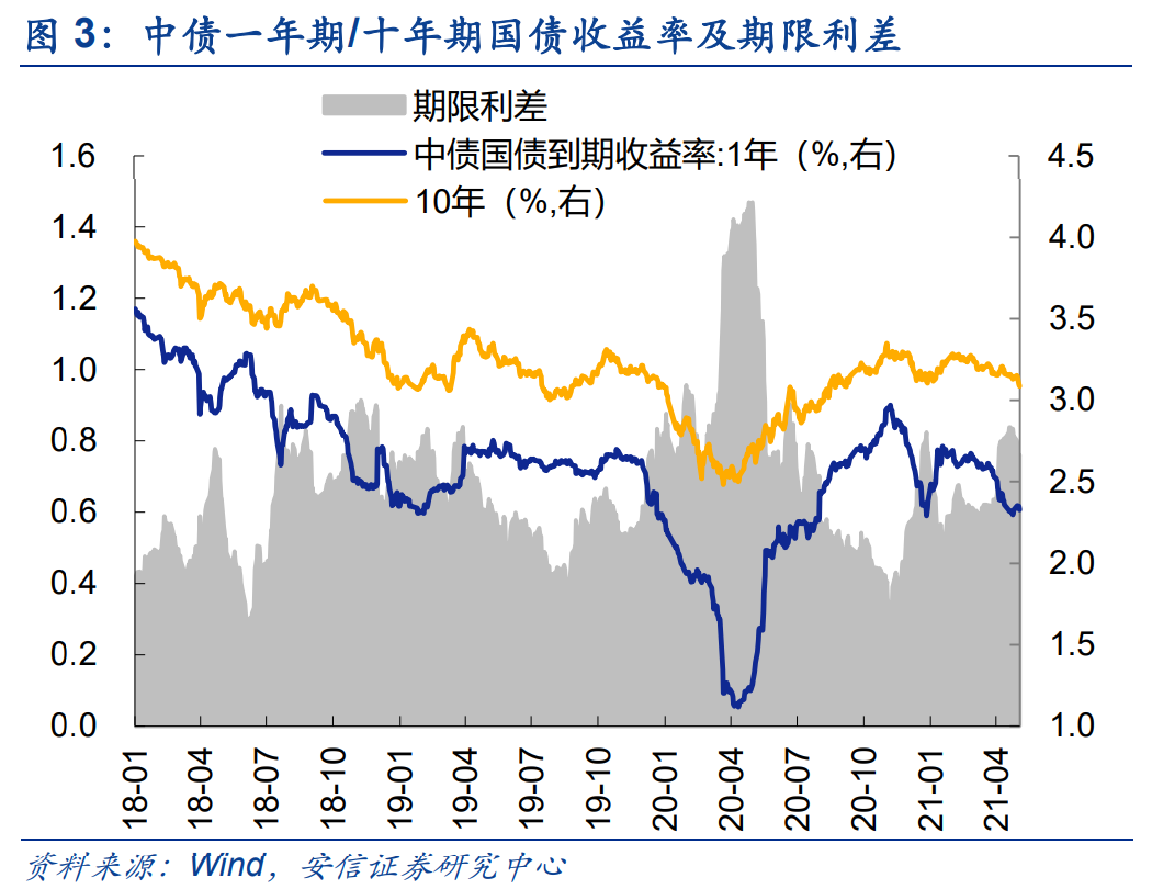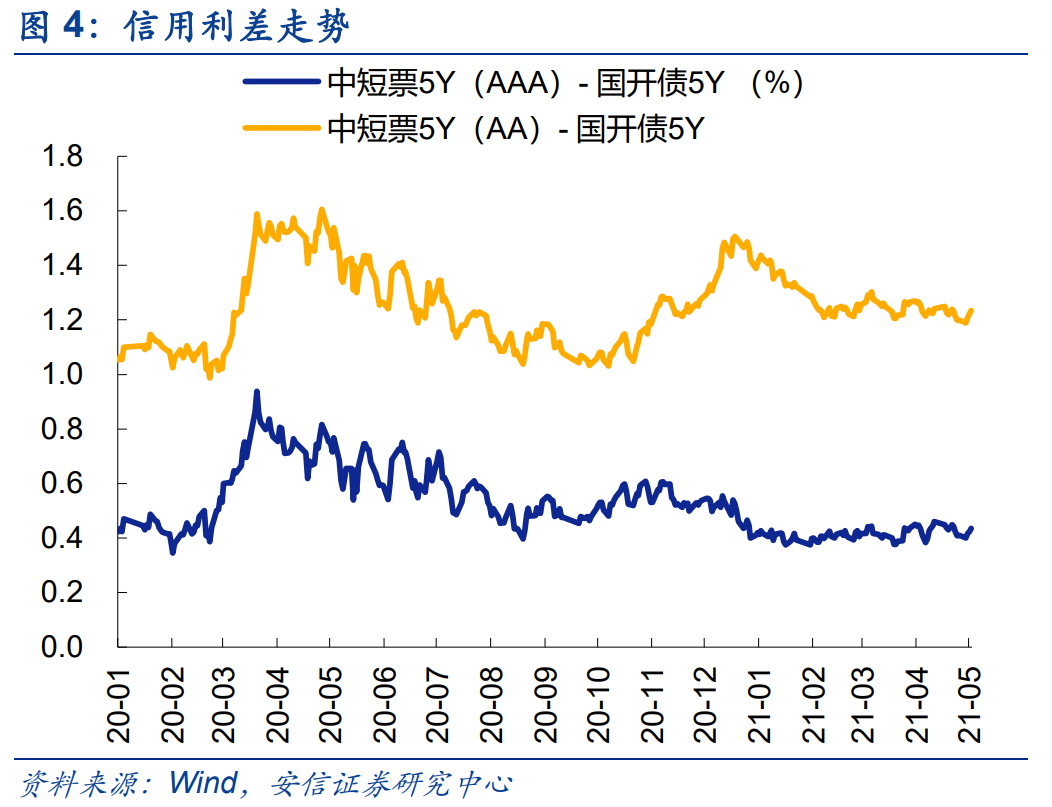 上周银行间市场资金面略有收敛。 至5月21日,R007和DR007均价为2.14%和2.11%,较前一周变化+16bp 和+12bp; R001和DR001均价2.00%和1.97%,较前一周变化+11bp和+16bp。近一周隔夜回购成交量环比有所下降。 近一周短端国债收益率仍维持低位水平 。至5月21日,一年期国债收益率和十年期国债收益率报2.32%和3.09%,较前周变化-0.3bp和-5.4bp;期限利差(10Y-1Y)76.0bp,较前一周收窄4.7bp。四月以来,一年期短端国债收益率累计下跌25.0bp,十年期国债收益率累计下跌10.1bp,期限利差扩大14.8bp。中美十年期国债利差2.40%,较前一周下降5.5bp。4月至今,中美十年期国债利差下降20.0bp,人民币汇率下跌1.98%。