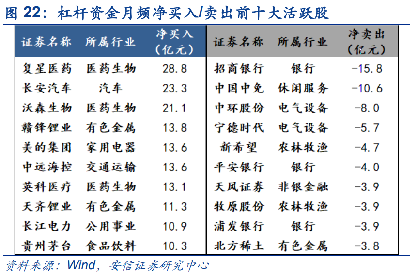 上周杠杆资金风险偏好有所提升 。上周(5.17-5.21)两融余额16909.0亿元,较前期增加151.7亿元;两融余额占A股流通市值2.56%,较前期上升0.02pct,处历史偏高位水平。两融交易额3972.2亿元,较前期增加130.1亿元;两融交易额占A股成交额9.58%,较前期增加0.36pct,风险偏好略有提升。其中,融资净买入164.8亿元,较前期增加34.8亿元;融资买入额占A股成交额为9.14%,环比上升0.39%,近期有所回暖。 医药、汽车净流入居前 。以周频看,至5月20日,医药(46.2亿)、汽车(18.9亿)、电子(11.6亿)获杠杆资金净增持居前,休闲服务(-3.5亿)、银行(-2.2)净减持居前。医药、汽车、非银、有色连续两周获杠杆资金大幅净增持。