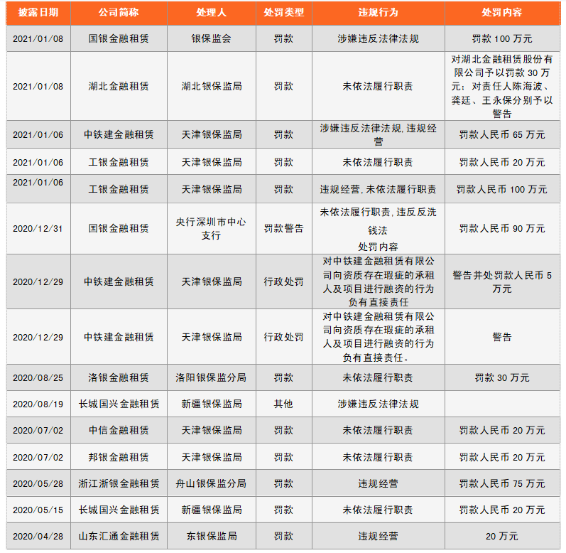 此外,2020年监管机构对金融租赁公司开出15张行政处罚单,总罚款金额595万元。