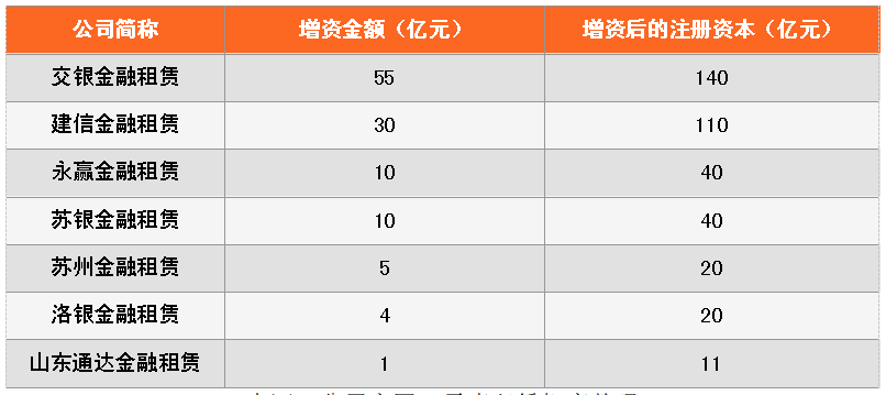 交银金融租赁增资额度最大,增资55亿元。交银金融租赁和建信金融租赁增资后,将自身注册资本提高至超过百亿元。