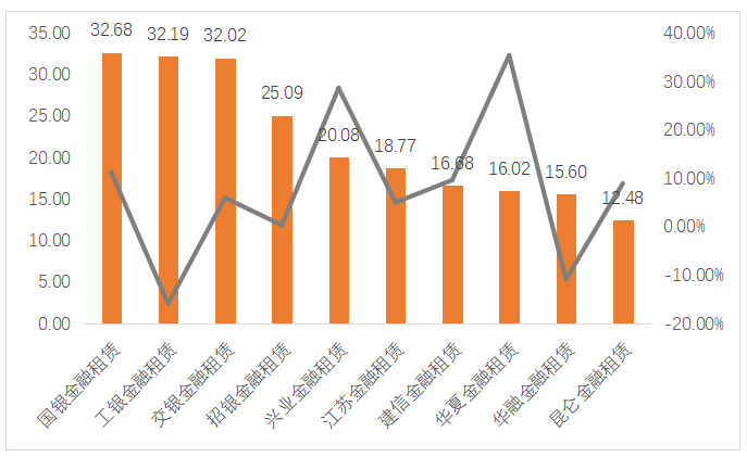 净利润排名前十的公司中,有3家公司净利润超30亿元,分别为国银租赁、工银租赁和交银租赁,三家公司净利润均在32亿元以上。