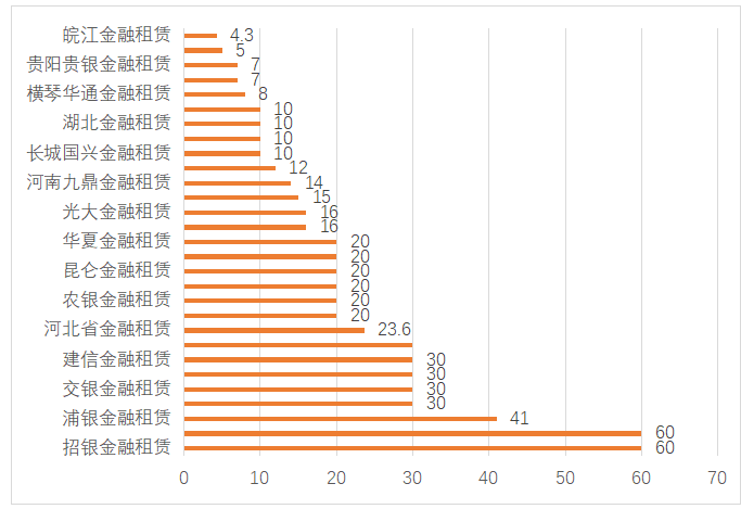 68家公司中,有3家公司注册资本最少,为5亿元,分别是九银金融租赁、兰银金融租赁、广融达金融租赁。