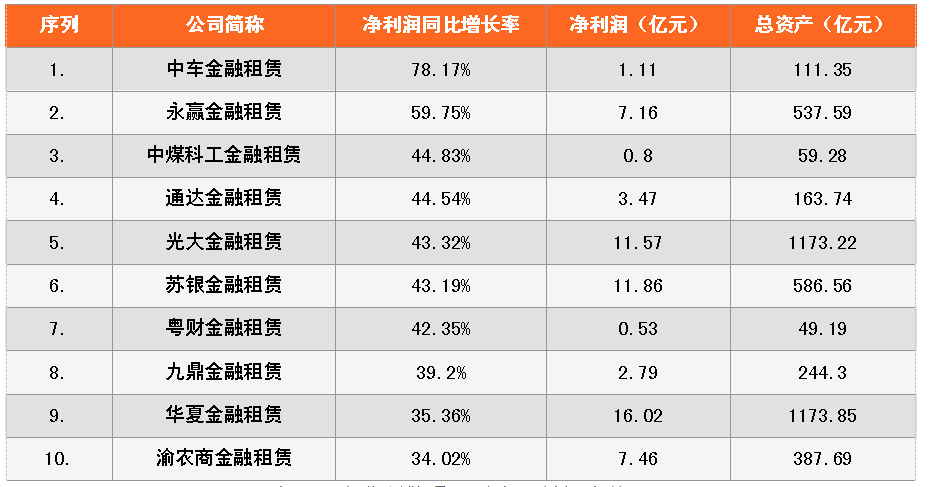 从净利润增长速度来看,增长速度前十的公司中,除光大金租和华夏金租外,均为总资产额1000亿元以下的腰部金租。