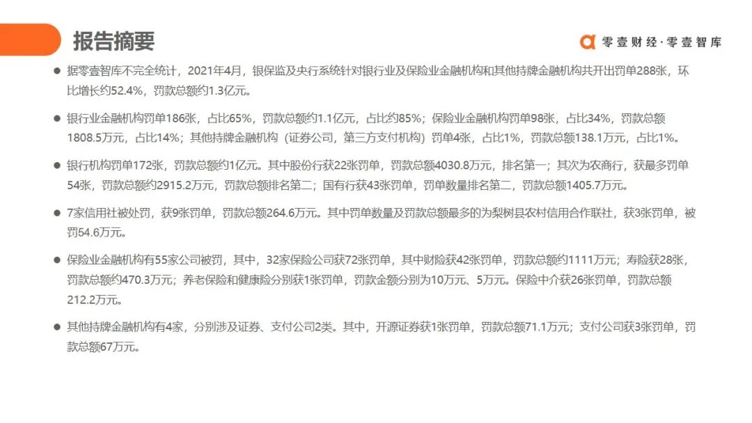 摘要 √ 据零壹智库不完全统计,2021年4月,银保监及央行系统针对银行业及保险业金融机构和其他持牌金融机构共开出罚单288张,环比增长约52.4%,罚款总额约1.3亿元。 (添加微信lycj002,可获取更多数据细节) √ 银行业金融机构罚单186张,占比65%,罚款总额约1.1亿元,占比约85%;保险业金融机构罚单98张,占比34%,罚款总额1808.5万元,占比14%;其他持牌金融机构(证券公司,第三方支付机构)罚单4张,占比1%,罚款总额138.1万元,占比1%。√ 银行机构罚单172张,罚款总额约1亿元。其中股份行获22张罚单,罚款总额4030.8万元,排名第一;其次为农商行,获最多罚单54张,罚款总额约2915.2万元,罚款总额排名第二;国有行获43张罚单,罚单数量排名第二,罚款总额1405.7万元。√ 7家信用社被处罚,获9张罚单,罚款总额264.6万元。其中罚单数量及罚款总额最多的为梨树县农村信用合作联社,获3张罚单,被罚54.6万元。√ 保险业金融机构有55家公司被罚,其中,32家保险公司获72张罚单,其中财险获42张罚单,罚款总额约1111万元;寿险获28张,罚款总额约470.3万元;养老保险和健康险分别获1张罚单,罚款金额分别为10万元、5万元。保险中介获26张罚单,罚款总额212.2万元。√ 其他持牌金融机构有4家,分别涉及证券、支付公司2类。其中,开源证券获1张罚单,罚款总额71.1万元;支付公司获3张罚单,罚款总额67万元。 出品|零壹智库 作者|颜晓妹 4月份银保监及央行行政处罚整体情况