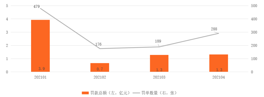 据零壹智库不完全统计,2021年4月(处罚公开日期,下同),银保监及央行系统针对银行业及保险业金融机构和其他持牌金融机构共开出罚单288张(此处罚单均指处罚对象为机构的,针对个人的罚单未包含在内,下同),环比增长约52.4%,罚款总额约1.3亿元,与上月基本持平。 数据来源:企业预警通,零壹智库