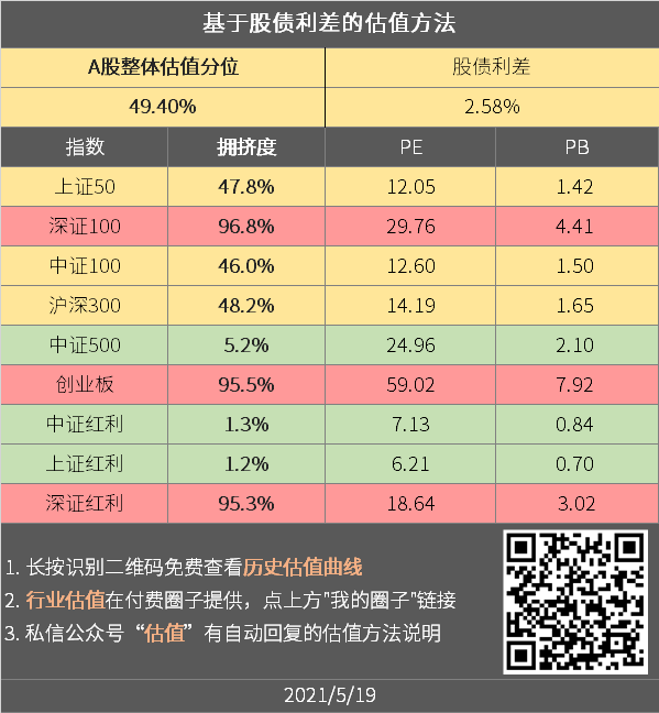 - 2021年5月19日,A股整体估值分位49.40%。私信公众号“估值”有估值方法说明。