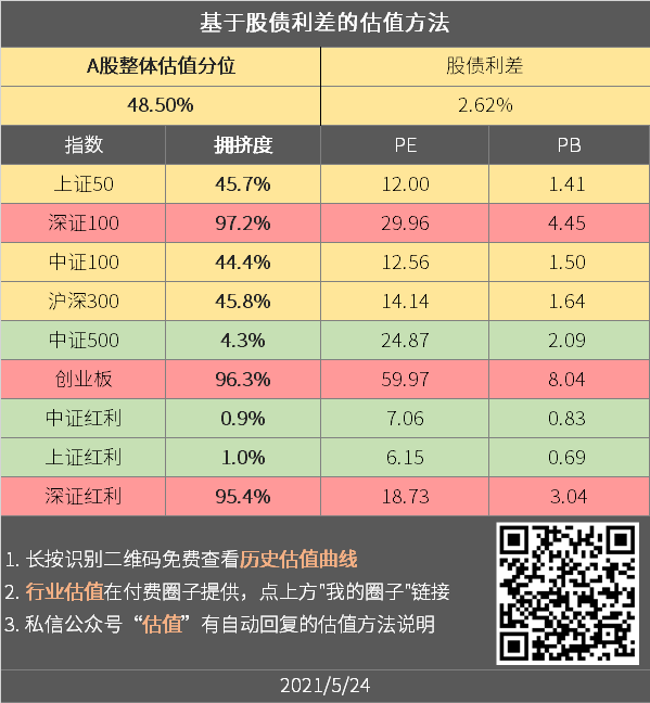 2021年5月24日,A股体估值分位48.50%。私信公众号“估值”有估值方法说明。