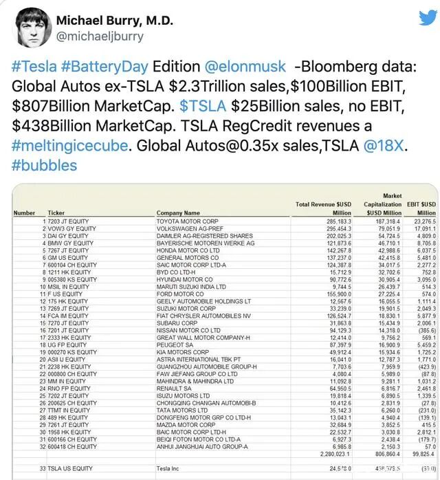 早在去年9月21日,迈克尔·伯里就曾指出,特斯拉的估值与行业其他公司相比实在是过于荒唐。他当时在推特上贴出一张截图对比: