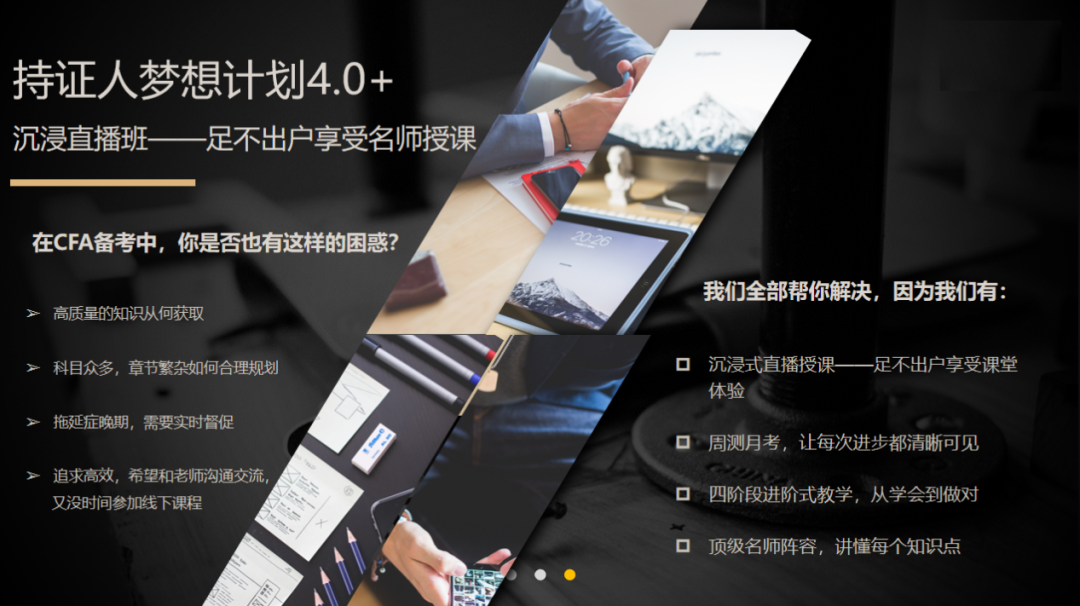 高顿教育基于在职学员的学习特点和CFA备考路径,将线下教学和线上资源整合,并结合当下金融人的学习特点,推出了 持证人梦想计划4.0+ 这款 全新的面授班产品。