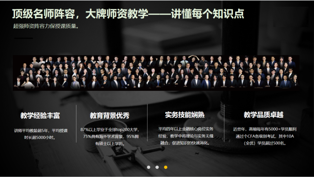 CFA的备考,讲求的是方法和效率, 持证人梦想计划数百人团队长期致力于帮助不同基础的考生通过CFA考试,搭建专业的教学模型,不断精研课程教学体系,力求渗透学员学习的每个环节,为高顿学子的学习之旅保驾护航。