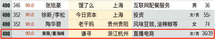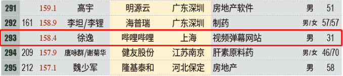 上榜的熟面孔是一如既往的多。 农夫山泉创始人钟睒睒[shǎn]成为中国首富,财富值超5000亿 ;今年3月刚刚宣布退休的拼多多创始人黄峥,力压“二马”,成为中国第二大富豪;马化腾、马云分居榜单第三、七位;链家、贝壳、自如的创始人左晖,排名第八,成为新一任地产首富、北京首富;小米的雷军不仅自己跻身TOP10,还带上了6名弟兄;新能源汽车三杰,李斌、何小鹏、李想成功会师富人榜。 “淘宝直播一姐”薇娅(黄薇)及其丈夫董海峰更是以90亿元财富值首次上榜,排名第490位。 与饿了么的张旭豪、今日资本的徐新、“老干妈”陶华碧“平起平坐”。 图源:新财富 此外,上榜的还有美团王兴、华为任正非、今日头条张一鸣、海底捞张勇/舒萍夫妇、京东刘强东/章泽天夫妇、万达王健林/王思聪父子、苏宁张近东/张康阳父子…… 而在这其中,有一个熟悉的品牌和一个陌生的名字扑入眼帘: 哔哩哔哩创始人徐逸,财富总值达158.4亿元,排在第293位, 是榜单中最年轻的白手起家亿万富豪,刚过31岁。