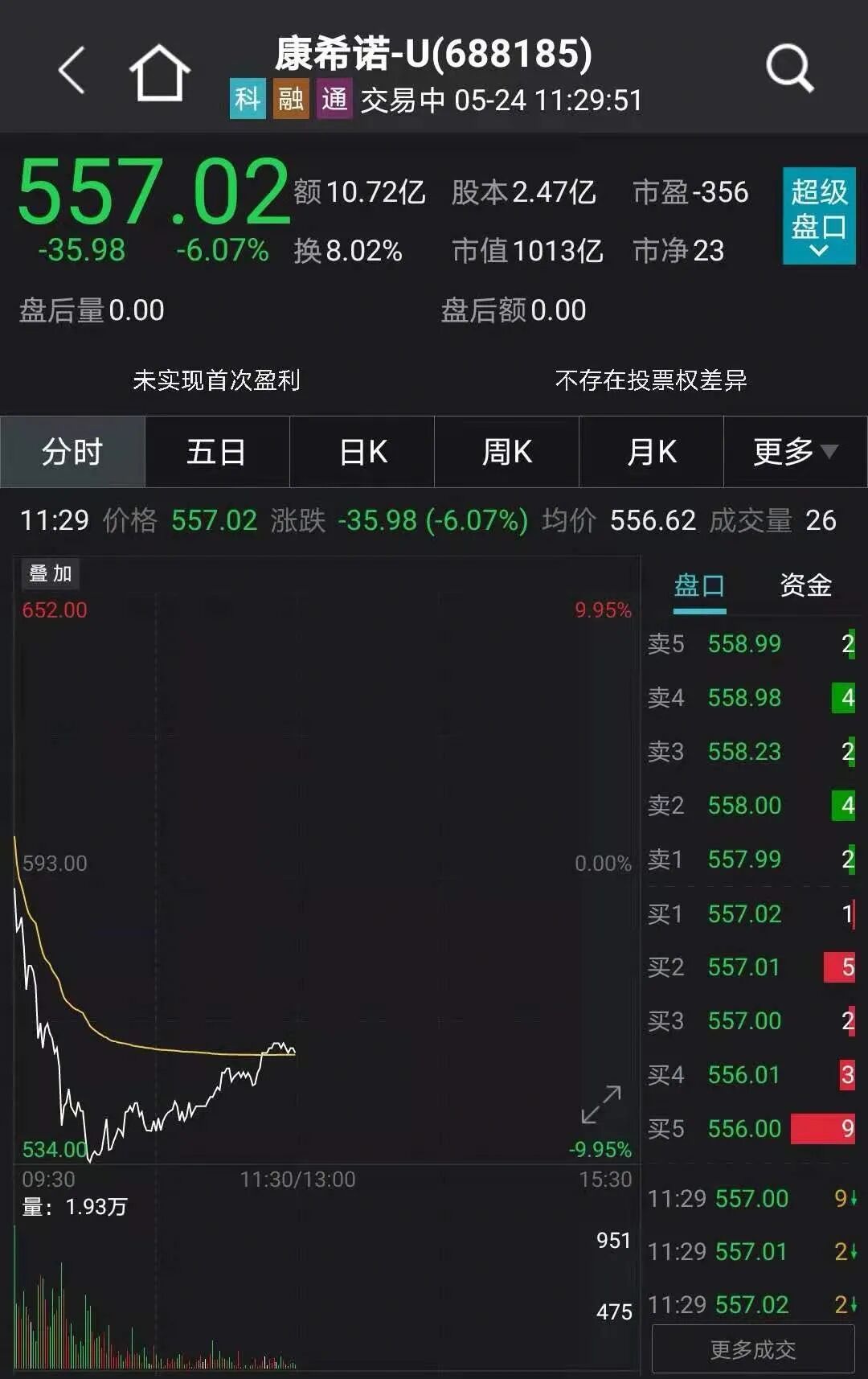 疫苗板块逆势下跌,康希诺-U盘中跌逾9%,中午收报557.02元/股,跌幅收窄至6.07%。