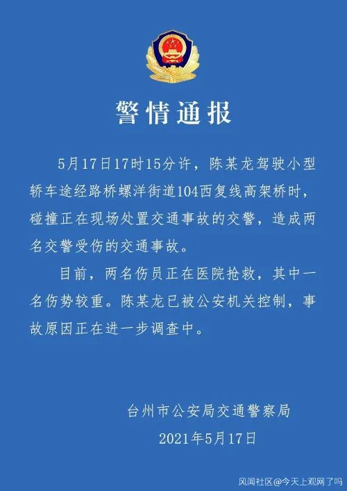 5月17日17时15分许,陈某龙驾驶小型轿车途经路桥螺洋街道104西复线高架桥时,碰撞正在现场处置交通事故的交警,造成两名交警受伤的交通事故。目前,两名伤员正在医院抢救,其中一名伤势较重。陈某龙已被公安机关控制,事故原因正在进一步调查中。