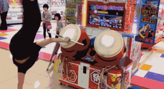 他们敲的都是《太鼓达人》的街机,触控鼓面很灵敏,其实不用使多大劲就能玩。