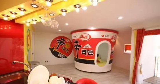 一个房间一晚送两碗辛拉面、半盒辣白菜和一整瓶的釜山酵素,并且可以无限续杯。