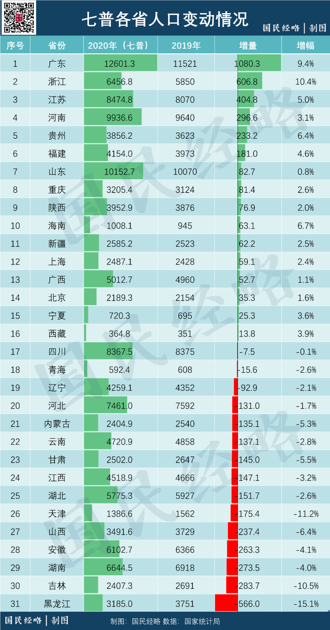 黑龙江变化幅度最大,2020年普查人口比2019年抽样统计人口少了566万人,降幅超过15%。