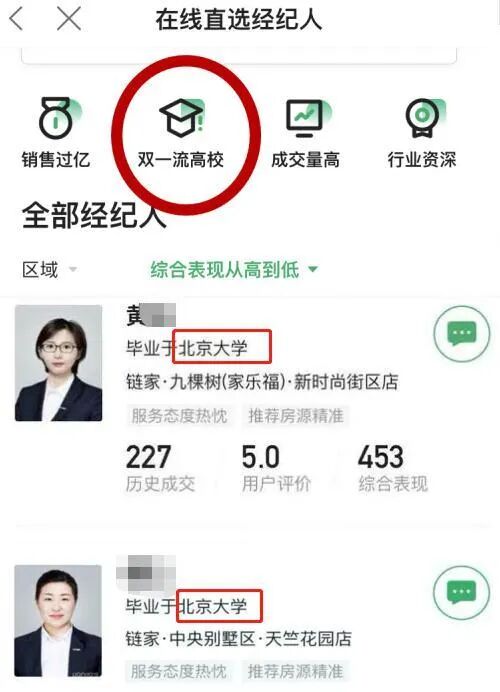 左晖觉得,一旦市场形成了正向循环,长期持续做正向积累,就具有无可比拟的优势,即便其他同行用同样的方式都无法做到赶超,这是一场“非对称的竞争”。 面对更多竞争者的出现,左晖表示并不担心,因为真正的竞争会促进整个组织的成长。 关于如何盈利,左晖也有着自己的坚持,“对商业来说,盈利根本不重要,你提供的价值是最重要的”,“只要你创造了价值,盈利不是早晚的事儿吗”。 第二大法宝:用高维人才干掉低维 在左晖的价值观中,“经纪人的尊严”是必须重视且要落实到位的。 而要获得“经纪人的尊严”,左晖喜欢查理.芒格说的那句话: 你要想得到什么东西,最好的方式就是能配得上。 在一张朋友圈流传的截图中,链家的经纪人中,不乏北京、上海双一流高校毕业的人。