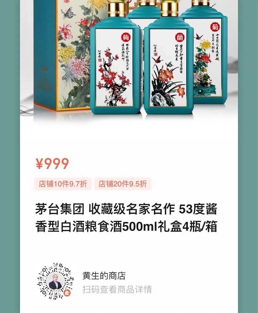 向大家郑重推荐茅台集团的收藏级名家名作酒,梅兰竹菊分别代表了中国国画的四君子,这款酒有收藏证书,特别适合收藏,别的地方这款酒价格是我们的几倍,我们向茅台集团争取到了一部分,以特惠价限量供应给我的粉丝,大家赶快长按下面的图片进入“黄生的商店”购买,购买了酒的粉丝请联系客服,让客服拉你进入黄生粉丝群,我们一起交流。